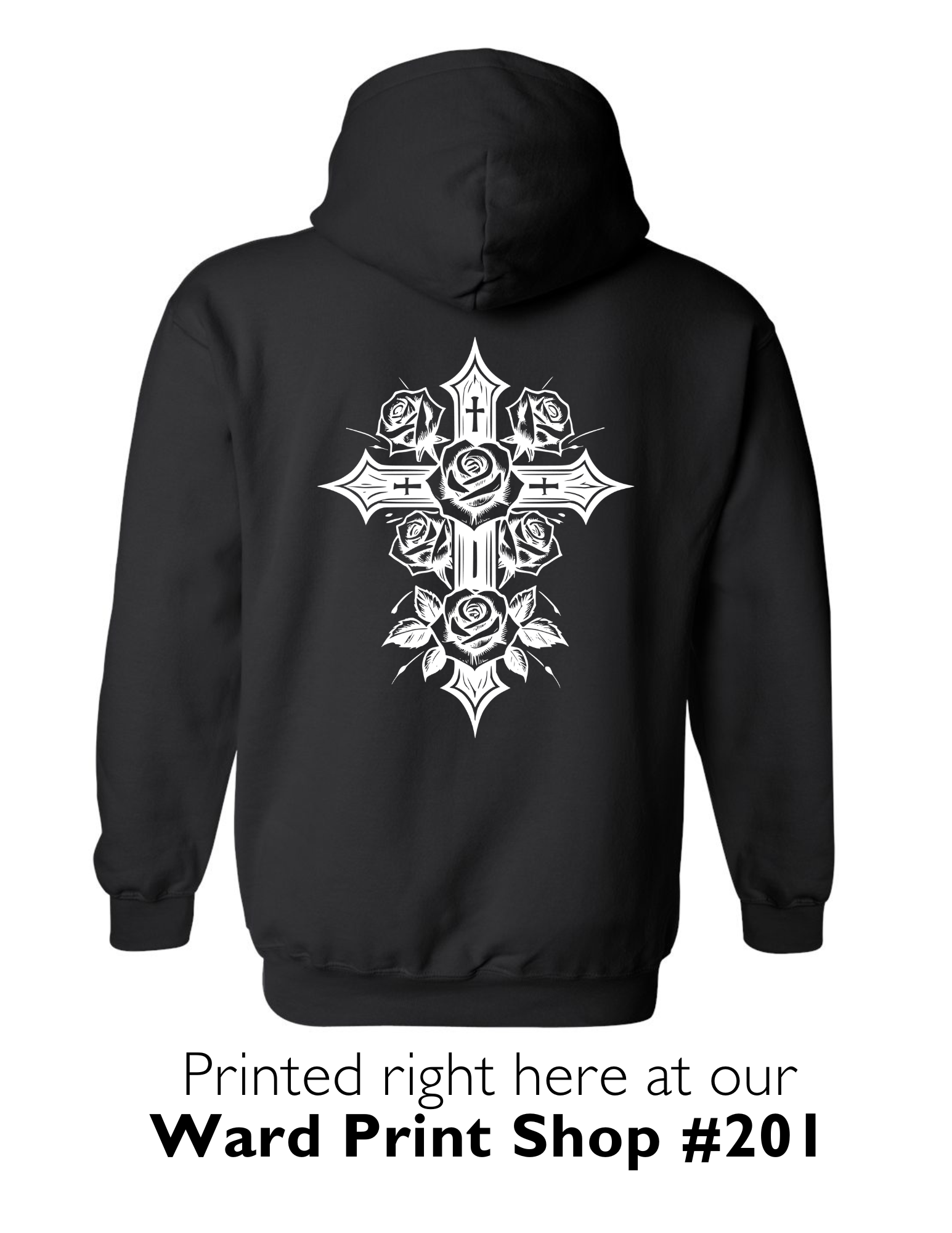 This sweatshirt is printed right here at our Ward Print Shop #201. This is a black Gildan - Heavy Blend™ Crewneck or Hoodie sweatshirt. This sweatshirt is printed on the back and front.